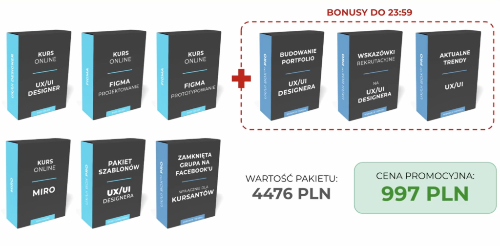 Pakiet wsparcia trenera w pakiecie UX/UI BOX™ PRO jest szerszy niż we wszystkich dostępnych kursach na żywo. Sam zakres obejmuje 4 kursy online, za które normalnie zapłaciłbyś kilka tysięcy złotych.