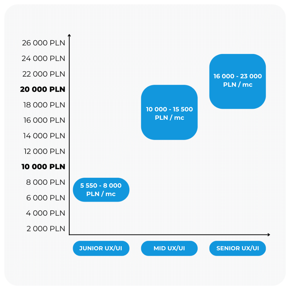 Zauważ, że już Junior UX/UI Designer, czyli osoba bez żadnego doświadczenia może liczyć na wynagrodzenie od 5 500 do 8 000 zł miesięcznie.