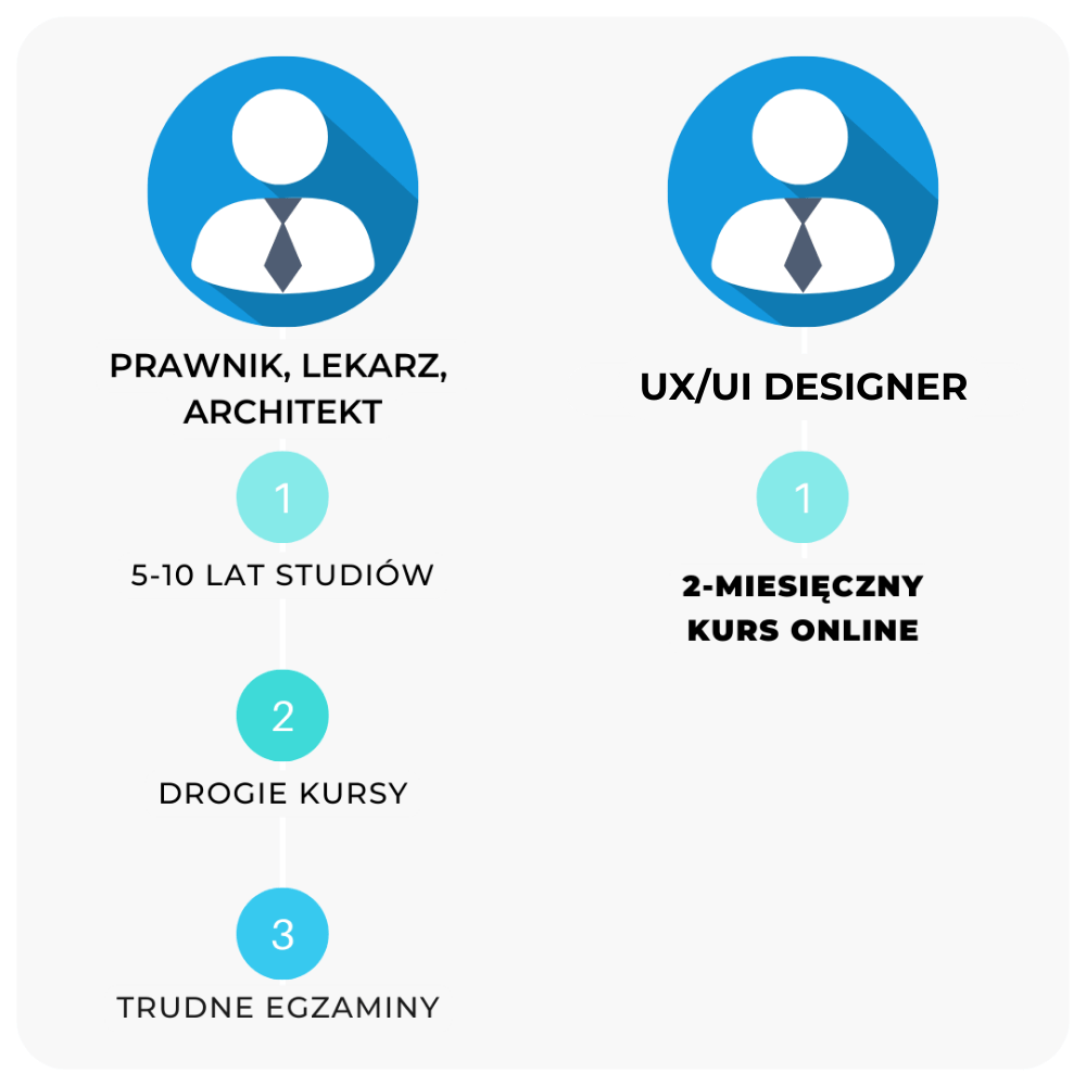 A teraz pomyśl o zawodzie UX/UI Designera. Zarobki zbliżone, a nawet wyższe na starcie. Ale zamiast 5-10 lat nauki masz kilka miesięcy. To chyba łatwy start, prawda?