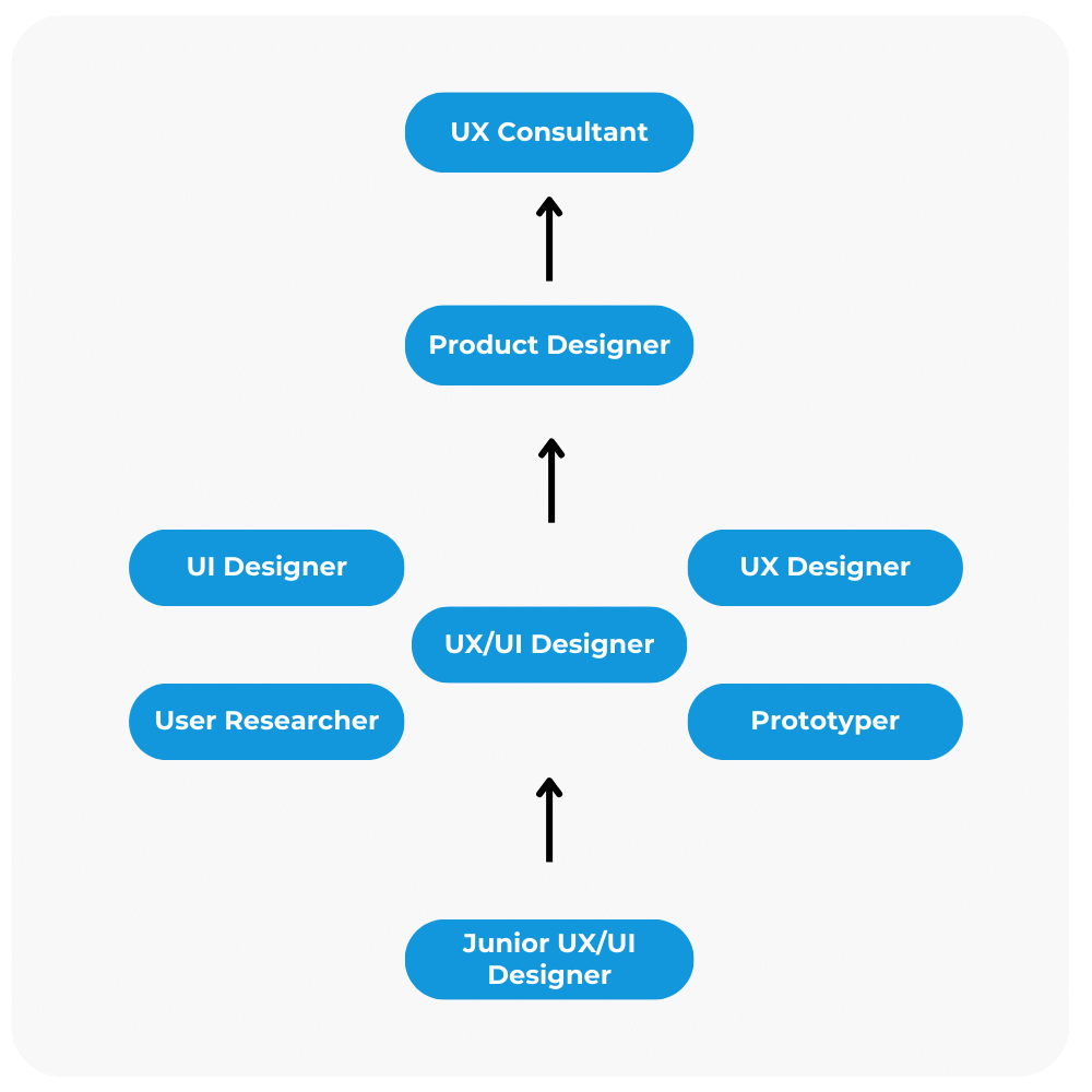 Kompetencje UX/UI Designera umożliwiają dynamiczny rozwój zawodowy w różnych kierunkach. Zaczynając jako Junior UX/UI Designer, następnie możesz wybrać którąś z 5 ścieżek: