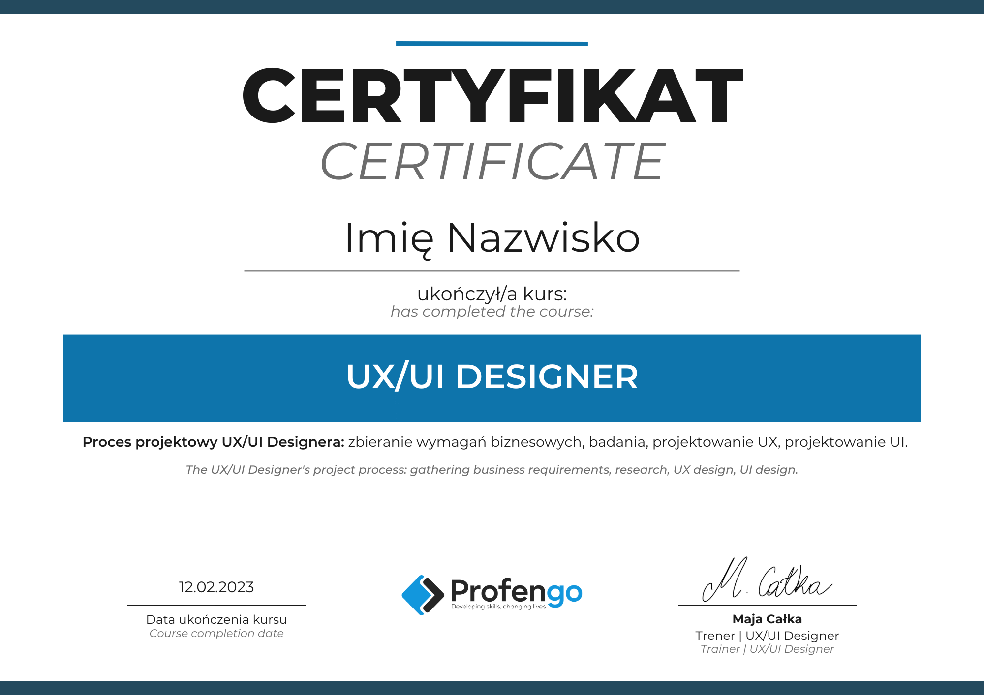 Certyfikat otrzymasz od razu po ukończeniu kursu “UX/UI Designer”. Otrzymasz go w formie elektronicznej więc nie musisz czekać, aż ktoś Ci go wyśle i zanim poczta go dostarczy.